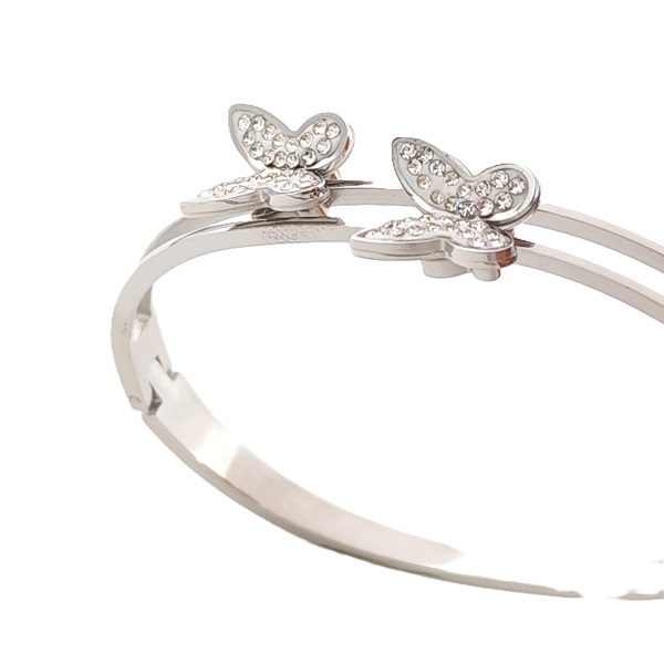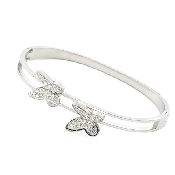 Изключително нежна и стилна дамска гривна от медицинска стомана със сребрист блясък и декоративни две пеперуди, обсипани с кристали.