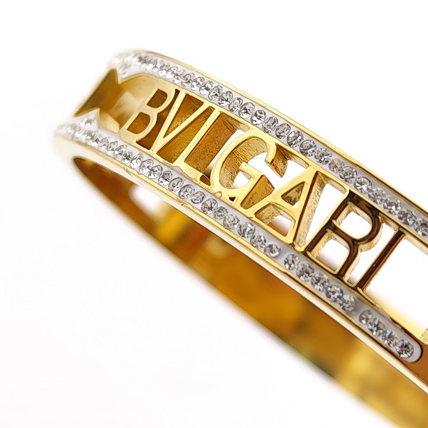 Изискана и луксозна дамска гривна от медицинска стомана в златист цвят с блестящи кристали по ръба и изрязан декоративен надпис.