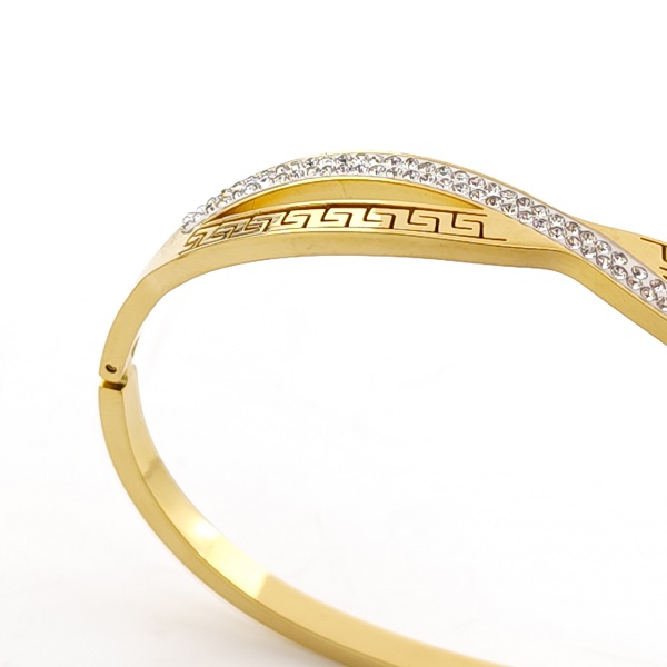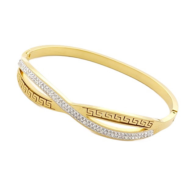 Стилна дамска гривна бенгъл от медицинска стомана с изискан златист цвят и декоративен гръцки орнамент.