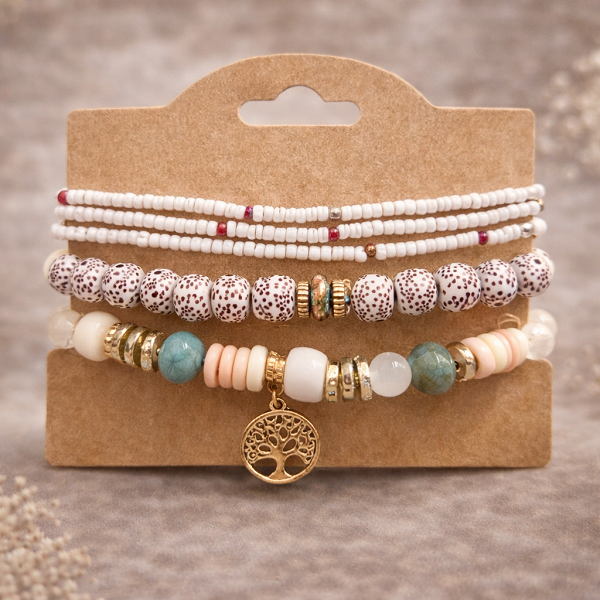 Дамска гривна с изчистена визия, съчетаваща бели и бежови мъниста с нежни цветни акценти и златисти декоративни елементи. Акцентът е красивата висулка дърво на живота, символ на хармония, сила и баланс.