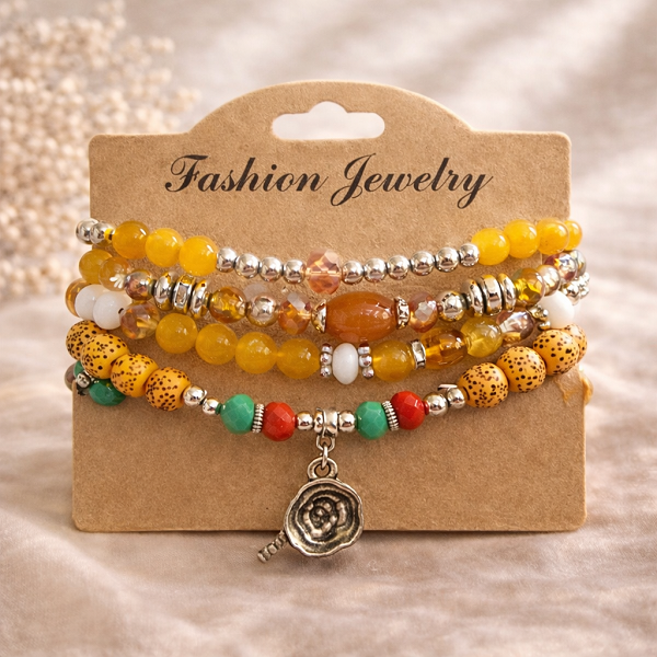 Свежа и стилна дамска гривна с ярки жълти мъниста, комбинирани с декоративни елементи в топли нюанси и метални акценти. Моделът се отличава с интересна висяща висулка, която придава индивидуалност и завършен вид.
