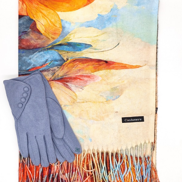 Впечатляващ подарък за жена – комплект шал и ръкавици с цветен мотив