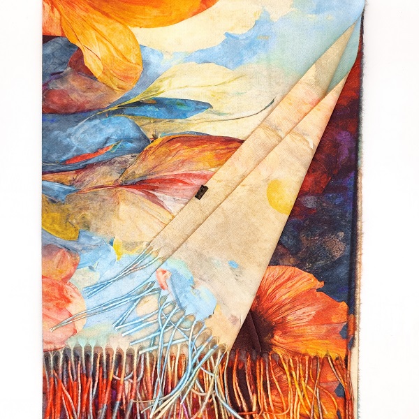 Дизайн: Цветен мотив с нюанси на синьо, оранжево и бежово