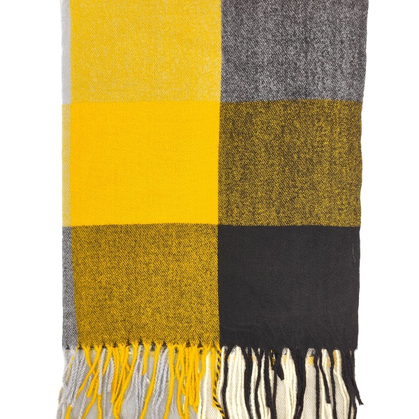 Дамски стилен шал на квадрати в черно и жълто с дълги ресни.