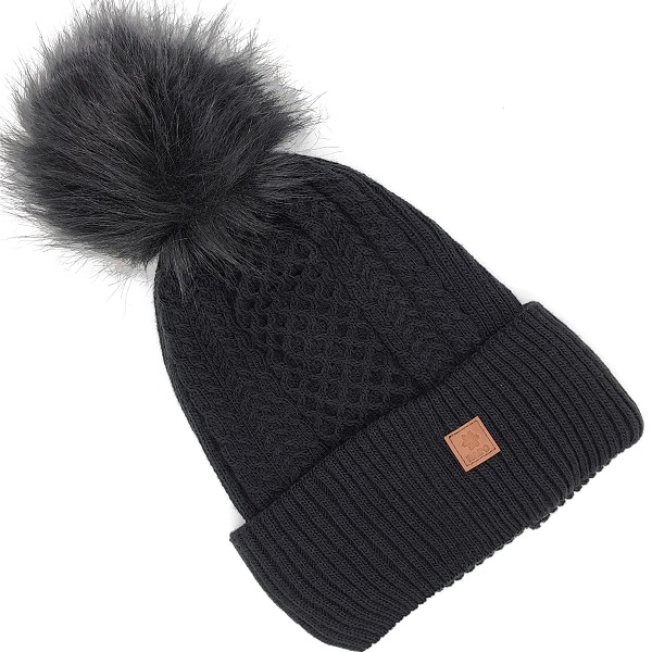 Плетена дамска зимна шапка с подгъв и пискюл от еко косъм.