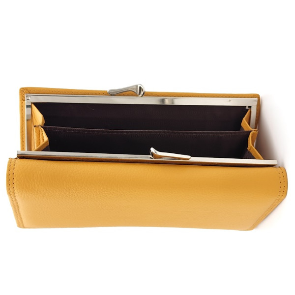 Лксозно дамско портмоне от естествена кожа горчица с външен монетник