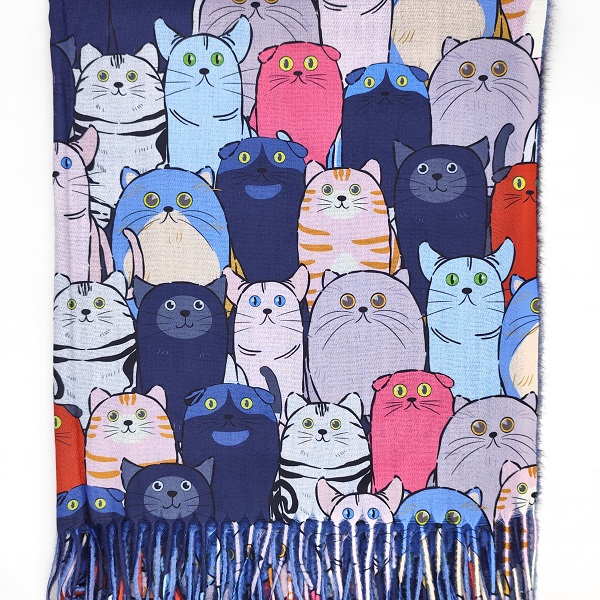 Кашмирен дамски шал с котки в синьо