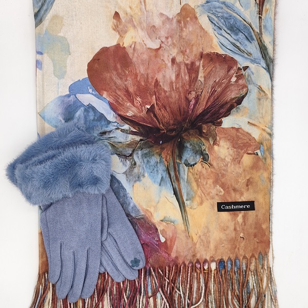 Елегантен комплект шал и ръкавици в синьо, който съчетава топлина, мекота и стил. Подходящ за луксозен подарък за жена за зимния сезон.
