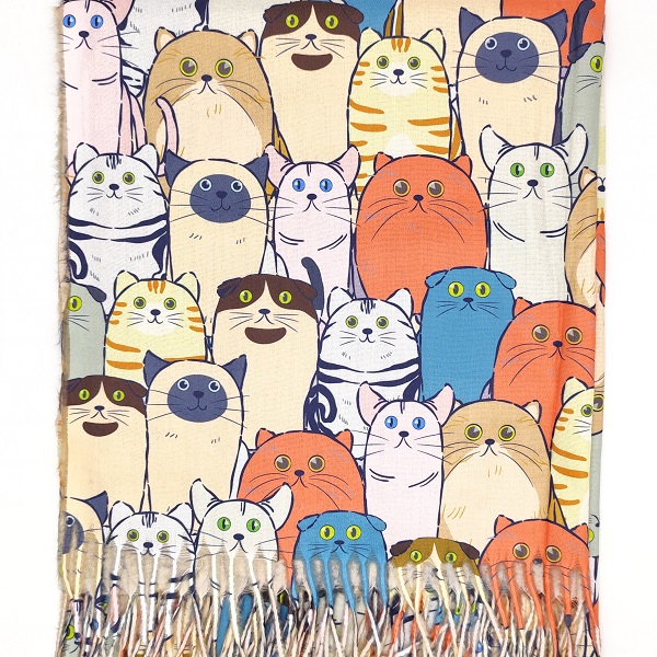 Очарователен дамски шал от кашмир с шарен принт на весели котки в жизнерадостни цветове – синьо, оранжево, бежово, лилаво и жълто. Материята е мека и комфортна, идеална за ежедневието и студените дни. Този модел внася настроение и усмивка във всяка визия – идеален аксесоар за любителите на котки и оригиналните детайли.