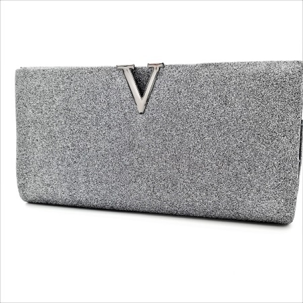 Представяме ви една истинска красота – дамска вечерна чанта-клъч в сребрист цвят. Изработена със ситен брокат, тази чанта блести, докато металната буква "V" в тъмно сребрист цвят добавя нотка на лукс и елегантност.