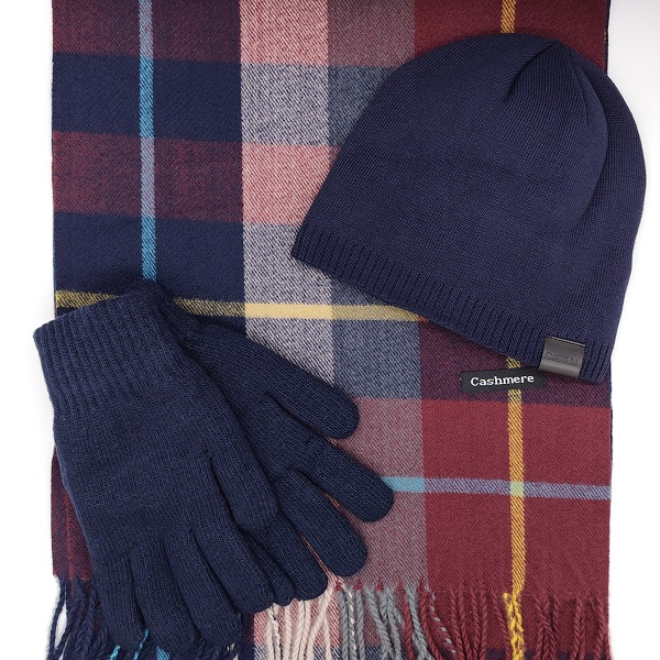 Мъжки комплект шал, шапка и ръкавици в тъмносиньо и бордо – коледен подарък за мъж