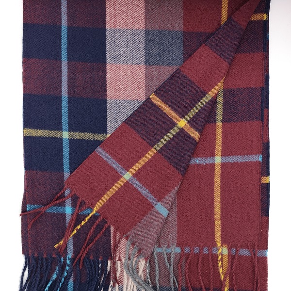 • Шал: кашмирен, в тъмносиньо и бордо с фини цветни линии, дълги ресни