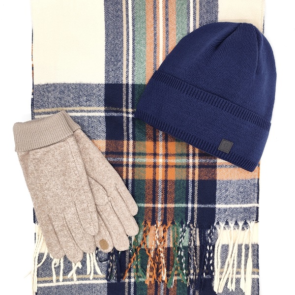 Мъжки зимен комплект шапка, шал и ръкавици – кашмирен шал в синьо каре, топла шапка и бежови ръкавици