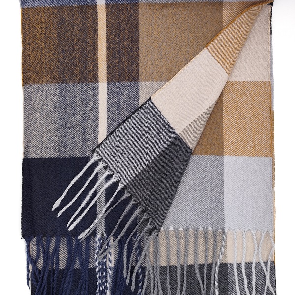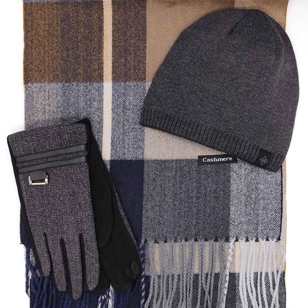 Шал, шапка и ръкавици – кашмирен шал в сиво, синьо и бежово каре, мъжки зимен комплект