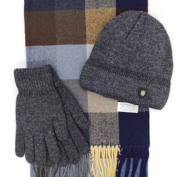 Шал, шапка и ръкавици – мъжки зимен комплект в сиво и синьо каре