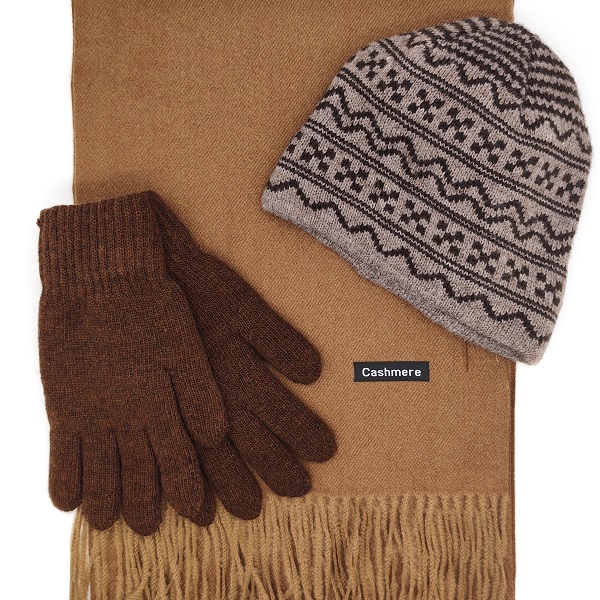 Цвят: бежов кашмирен шал, кафяви ръкавици, шапка в бежово с кафяви мотиви