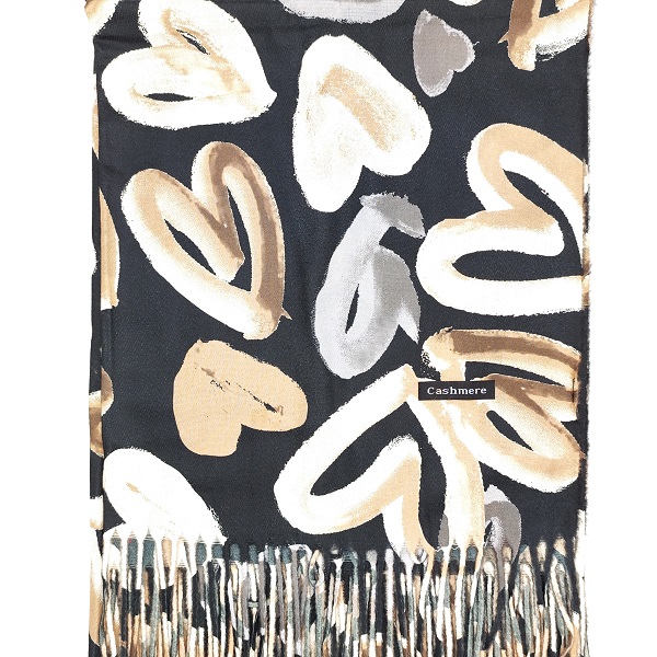 Луксозен дамски кашмирен шал в черно с бежови сърца и ресни