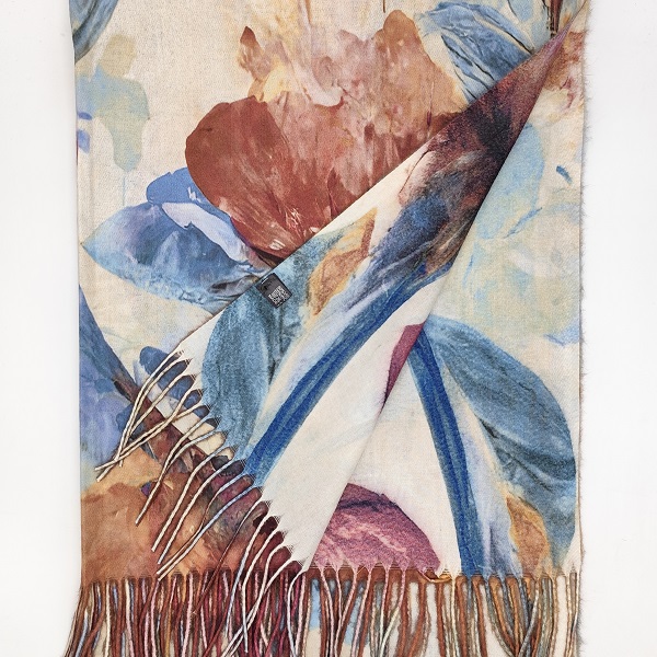 Луксозен дамски шал от кашмир с впечатляващ дизайн на голямо цвете в кафяво и синьо. Топлата и мека материя осигурява комфорт през студените дни, а нежното съчетание на цветовете придава артистичен и изискан вид. Перфектен аксесоар за палто, яке или плетен пуловер.