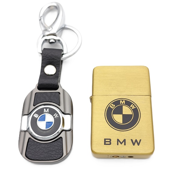 Подаръчен комплект за мъж БМВ– Газова запалка с джет пламък и ключодържател от естествена кожа