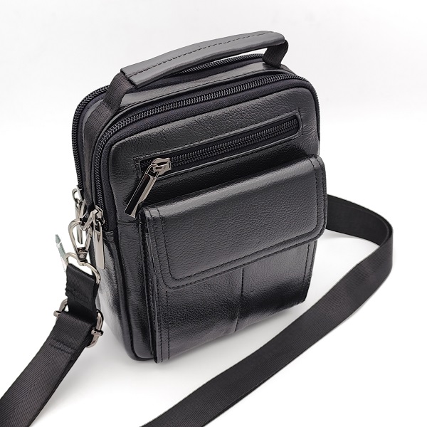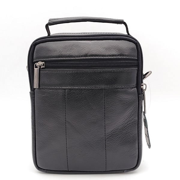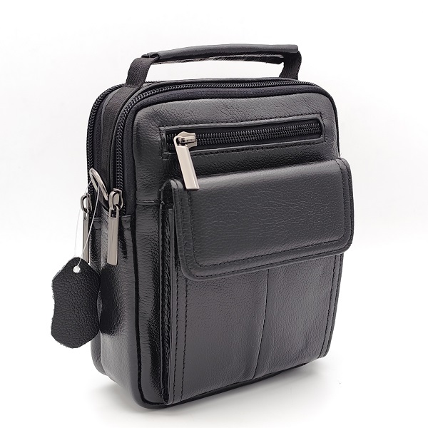 Мъжка чанта от естествена кожа за през рамо с дръжка за ръка и капак на джоба черна