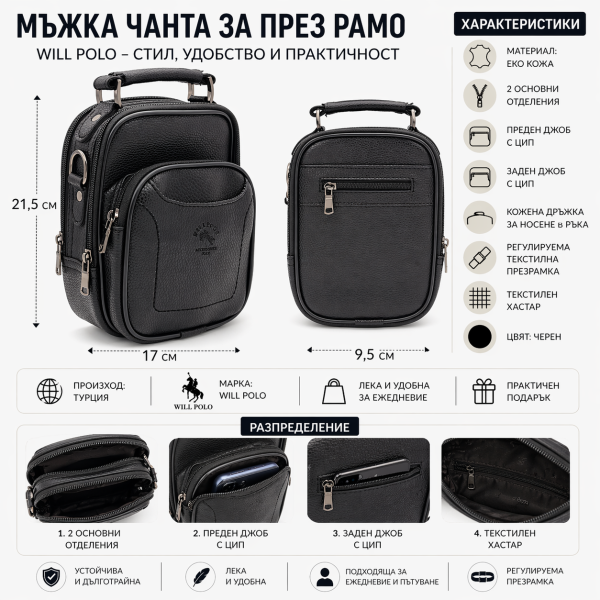 Стилна мъжка чанта за през рамо Will Polo от еко кожа, съчетаваща модерен дизайн, практичност и удобство. Моделът е подходящ за ежедневие, работа или разходка, като осигурява достатъчно място за всички необходими вещи.