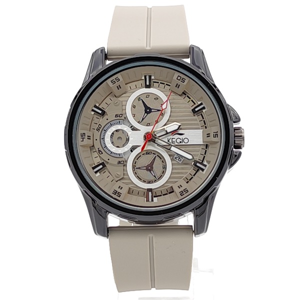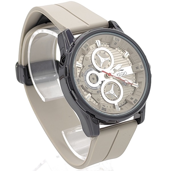 Модерен мъжки часовник със светъл бежов циферблат и стилен тъмен корпус, съчетаващ спортна визия и елегантни детайли. Моделът е със силиконова каишка в светъл тон, която осигурява комфорт при ежедневно носене. Подходящ аксесоар за мъж с динамичен и съвременен стил.