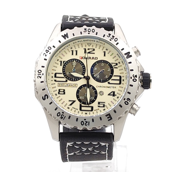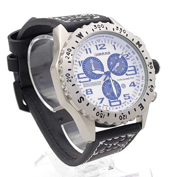 Масивен спортен мъжки часовник със светъл циферблат, ясно четими цифри и контрастни декоративни скали. Корпусът е изработен от медицинска стомана, което осигурява здравина и устойчивост, а черната кожена каишка с бели шевове подчертава динамичния стил на модела. Подходящ аксесоар за ежедневие и активен начин на живот.