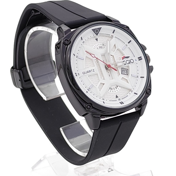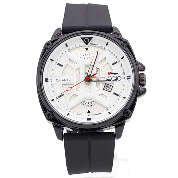 Модерен мъжки часовник със спортно-елегантна визия, бял релефен циферблат и черен корпус от медицинска стомана. Моделът е със силиконова каишка, която осигурява комфорт при ежедневно носене и активен начин на живот. Практичен и стилен аксесоар за мъж.