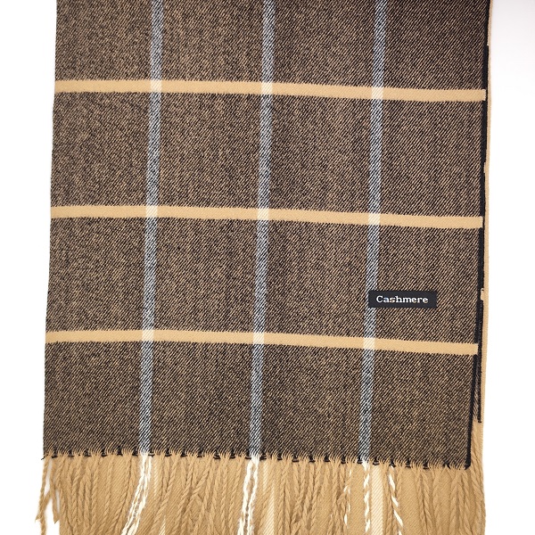 Шал: 100% кашмир, в кафяво и бежово с деликатни линии в светлосиво, ресни по краищата
