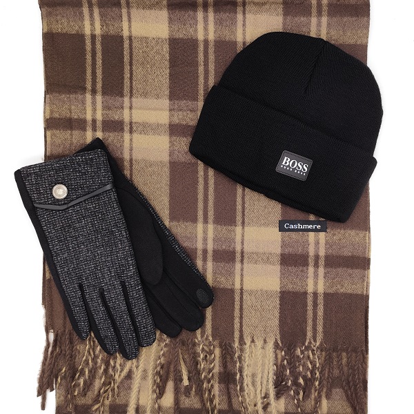 Този мъжки зимен комплект е създаден за модерния мъж, който държи на елегантността, уюта и качеството през студените месеци. Комбинацията от черна шапка BOSS, кашмирен шал в кафяво каре и елегантни ръкавици в черно и графитен цвят създава изискан и завършен зимен стил.