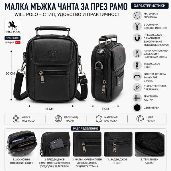 Компактна мъжка чанта за през рамо Will Polo от еко кожа, създадена за мъже, които търсят удобство и практичност в малък размер. Моделът е идеален за ежедневие, когато искате да носите само най-необходимото.