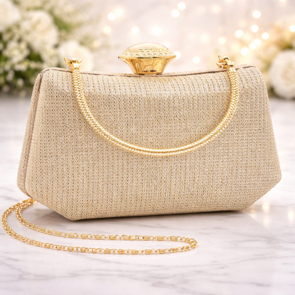 Малка официална чанта с нестандартен дизайн с дръжка и синджир златиста