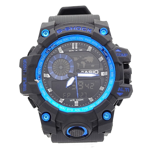Мъжки часовник реплика с впечатляващ дизайн в черно и синьо, комбиниращ дигитален и аналогов дисплей. Подходящ за мъже, които обичат модерните и функционални аксесоари.