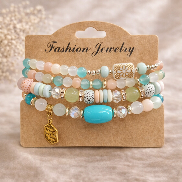 Изключително красива дамска гривна, съчетаваща пастелни мъниста в меки нюанси и стилни декоративни елементи. Акцентът е свежият дизайн с цветни детайли и кристали, които придават лекота и модерно излъчване.