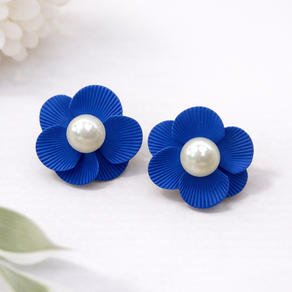Обеци на винт цвете с перла в турско синьо