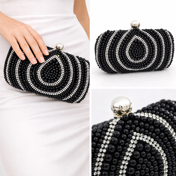 Официална черна чанта с перли и камъни – абитуриентска клъч чанта за бал