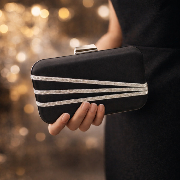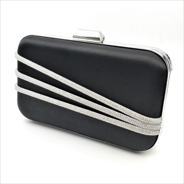 Официална дамска чанта клъч в черно с камъни сатенена