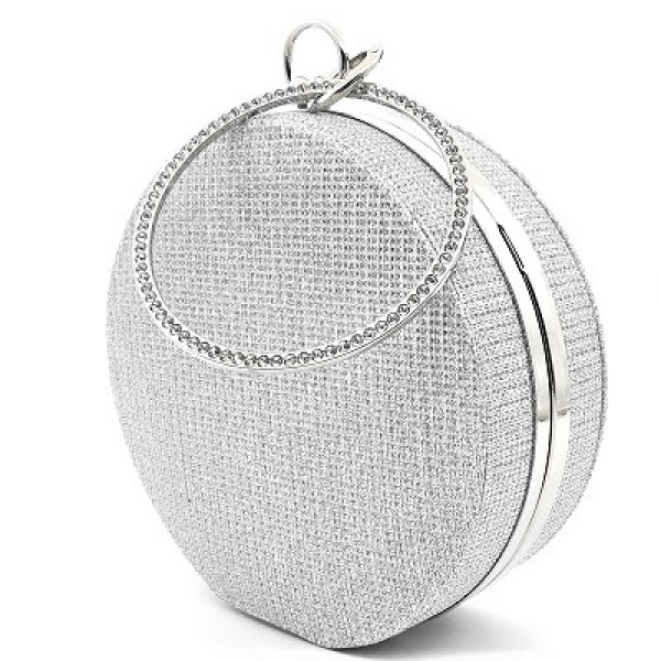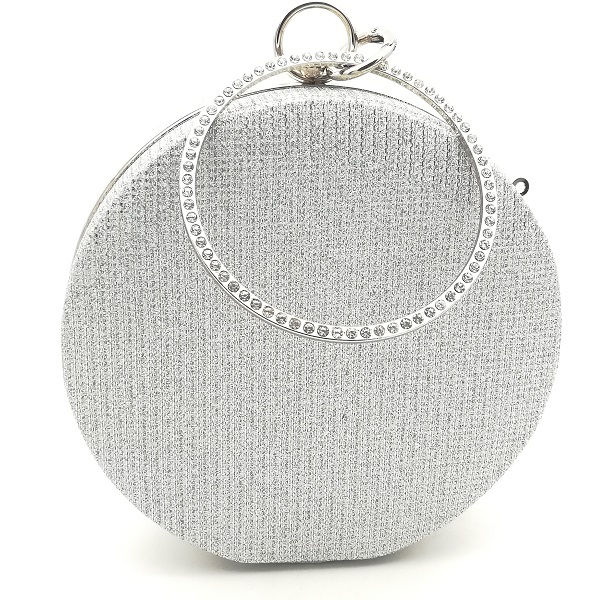 Клъч чанта в сребрист цвят кръгла със сребърен кант, дълга дръжка тип синджир и допълнителна твърда дръжка кръгла с бели циркониеви камъчета. Подходяща за абитуриентски бал, сватба, вечерно излизане на бар или дискотека. Цялата обсипана с нежен брокат.