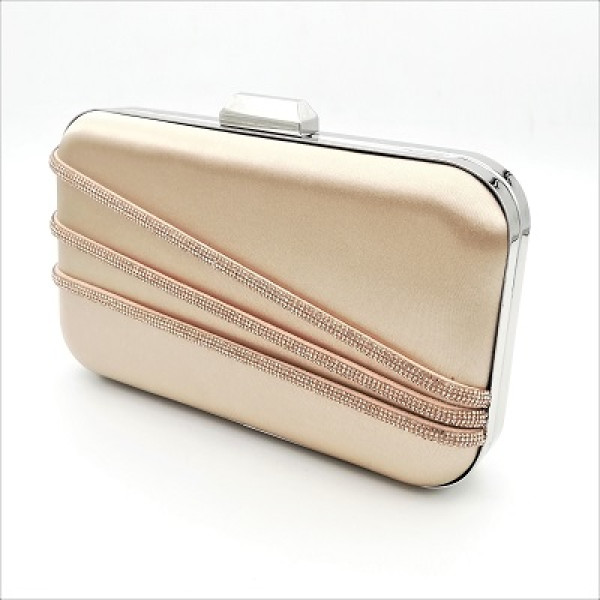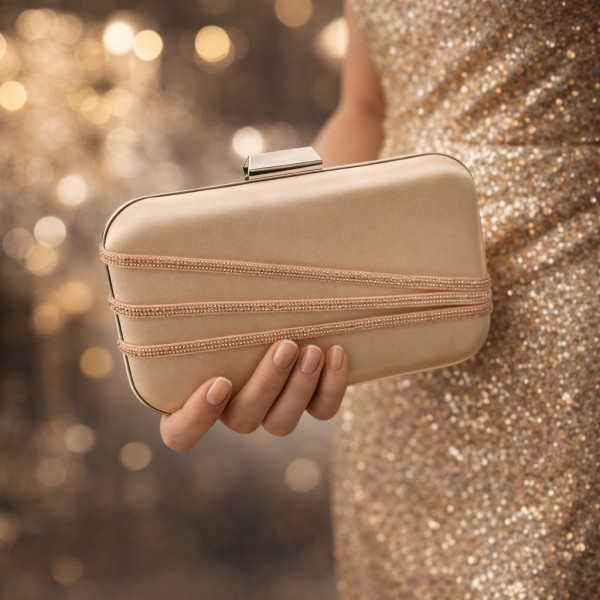 Малка официална чанта клъч с нежен сатенен плат в бежов цвят.