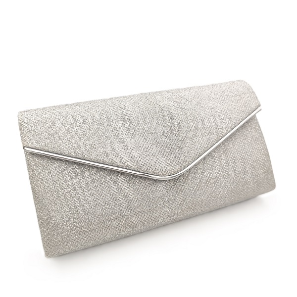 Официална дамска чанта клъч тип плик в сребристо с брокат, изискана и бляскава, перфектна за вашите специални моменти. Произведена в Турция, от новата колекция, тя е стилно допълнение към всеки официален тоалет. Чантата е покрита с фини блестящи частици, които й придават луксозен и елегантен вид, идеален за сватби, кръщенета, рождени дни и други важни събития.