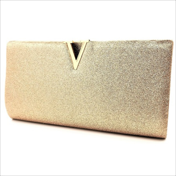 Официална бална дамска чанта клъч Златиста обсипана със ситен брокат , декорирана със златиста метална емблема "V".