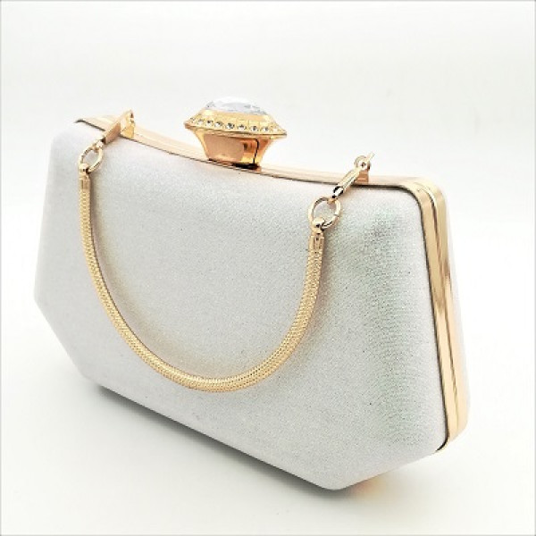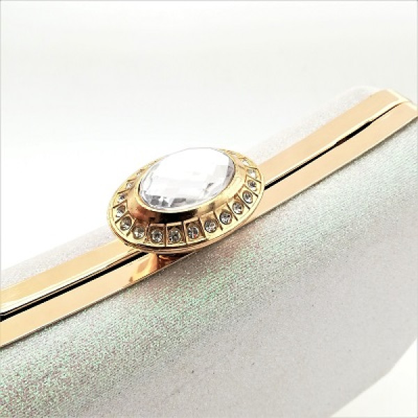 Бутона за отваряне на чанта е декориран с голям бял кристал заобиколен от малки бели камъчета.