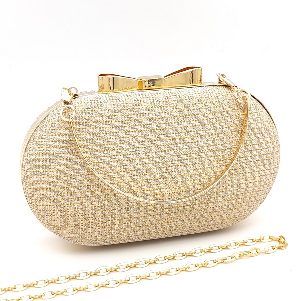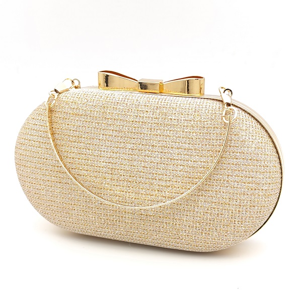 Изискана официална чанта клъч в елегантен златист цвят с фин брокатен блясък, която придава стил и блясък на всяка визия. Горната част е завършена с метална панделка в златисто, която подчертава нежността и луксозния дизайн. Чантата предлага удобство с къса дръжка и дълъг синджир 120 см в златисто, позволяващи различни начини на носене. Подходяща за балове, сватби, коктейли и официални вечери, когато аксесоарът е ключов детайл.
