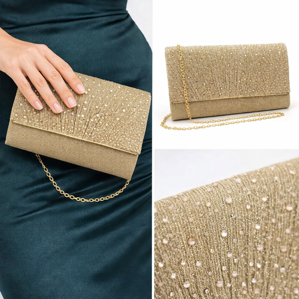 Елегантна абитуриентска чанта клъч в златист цвят, създадена да допълни перфектно визията ти за специални поводи. Фината текстилна основа с брокатен ефект и деликатни камъни придава блясък и луксозно излъчване, което няма да остане незабелязано.
