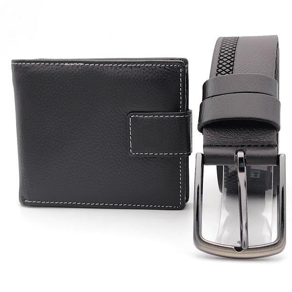 Подарък за мъж-Колан с декорация и портфейл в черно от естествена кожа
