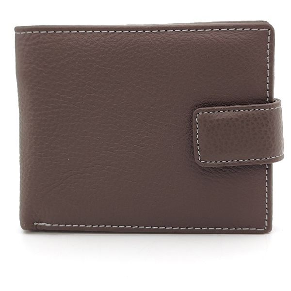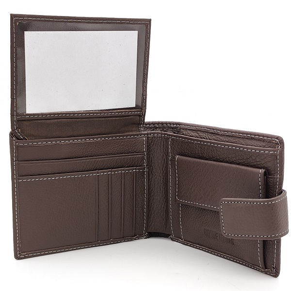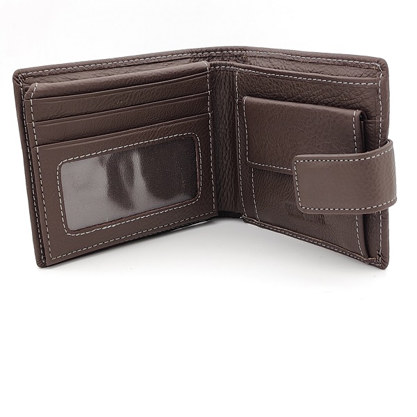 Портфейлът е от естествена кожа с контрастен бял декоративен шев и външно магнитно закопчаване. Вътрешността предлага множество отделения за карти и документи, отделения за банкноти и джоб за монети, а хастарът също е от естествена кожа, което подчертава качеството на изработката.
