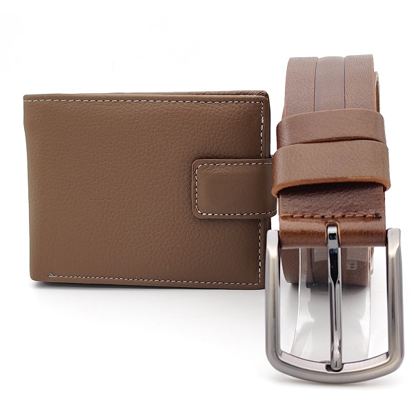 Практичен и стилен комплект колан и портфейл от естествена кожа в кафяво, подходящ за ежедневие и официални поводи. Класическата визия и качествената изработка го превръщат в отличен избор за подарък за мъж. Комплектът съчетава удобство, функционалност и елегантен дизайн, който се комбинира лесно с дънки или панталон.