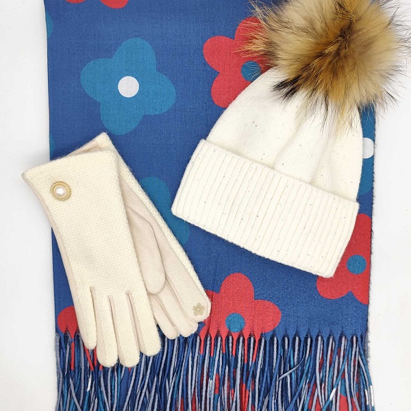 Шал, шапка с пух и ръкавици с копче-Дамски подаръчен комплект