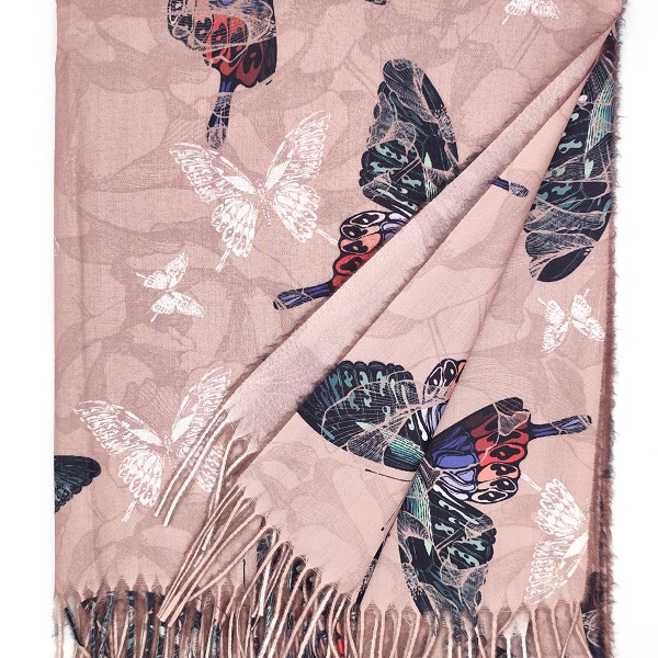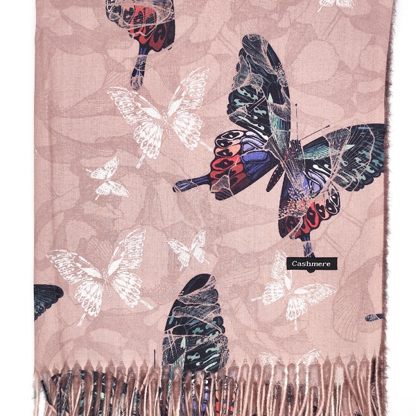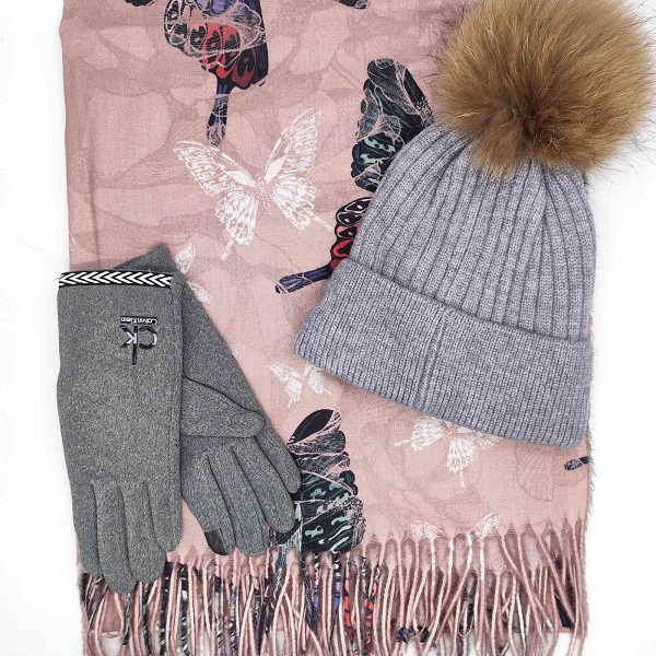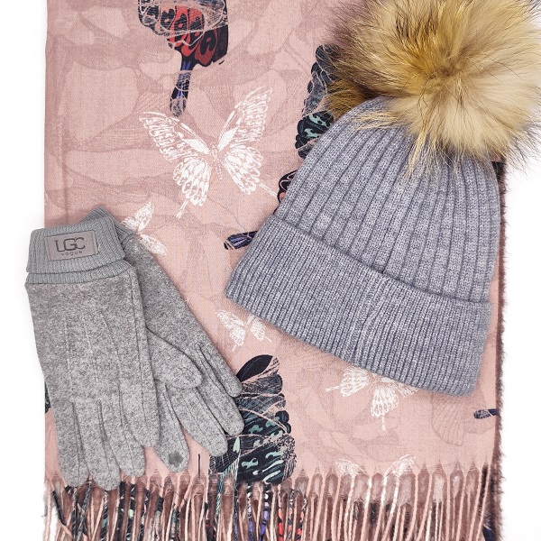 Комплект шапка, шал и ръкавици в розово и сиво с пеперуди – елегантен подарък за жена
