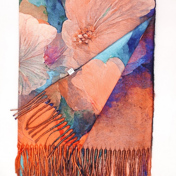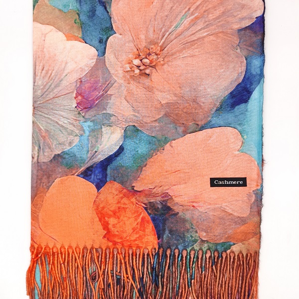 Нежен и изискан дамски кашмирен шал с впечатляващ флорален мотив в меки нюанси на прасковено, синьо и коралово. Материята от кашмир е приятна на допир и придава усещане за топлина и комфорт, а големите цветя създават усещане за свежест и женственост. Подходящ за всяка дама, която обича да допълва визията си с фин и стилен аксесоар.